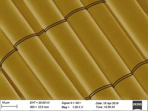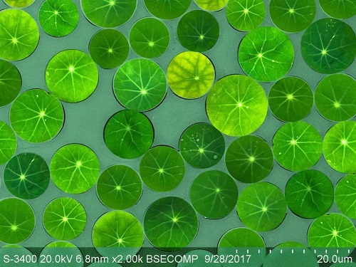 2000倍掃描電子顯微鏡下,復合材料層壓板端面,清晰地顯示了玻璃纖維織物與樹脂結合的樣子,玻纖紗如水中蓮葉般排列。