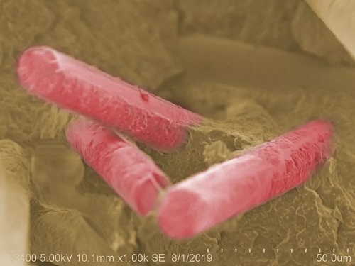掃描電子顯微鏡下,短切原絲增強熱塑性塑料的斷面,短切原絲仿佛一根根誘人的紅色香腸,分散在塑料基體中。