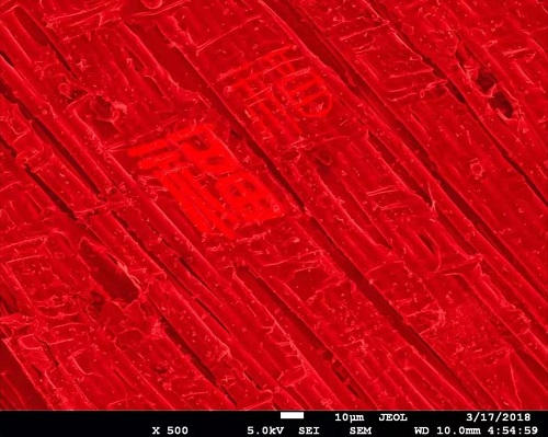 電鏡下的復合材料纖維樹脂結合層。玻璃纖維與樹脂結合出橫豎交錯的紋路,勾勒出一個個“福”字輪廓,是復材也是“福”材。
