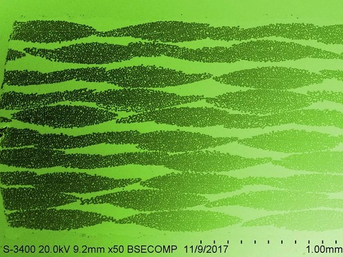 掃描電子顯微鏡下的復合材料層壓板端面,玻璃纖維織物與樹脂結合后,猶如一片片樹葉錯落分布。