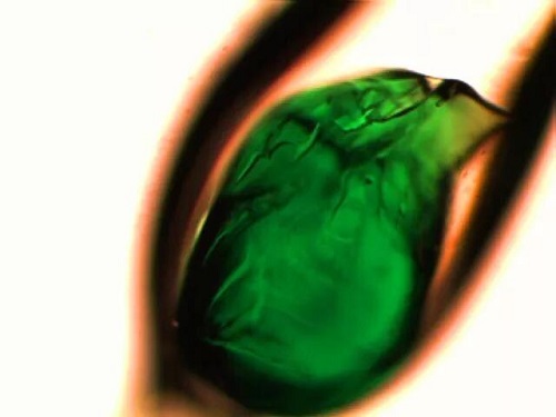 偏光顯微鏡下,玻璃纖維特殊斷頭,其中存在不同粘度的玻璃形態(tài),高粘玻璃仿佛一只正在火中涅槃重生的鳥。